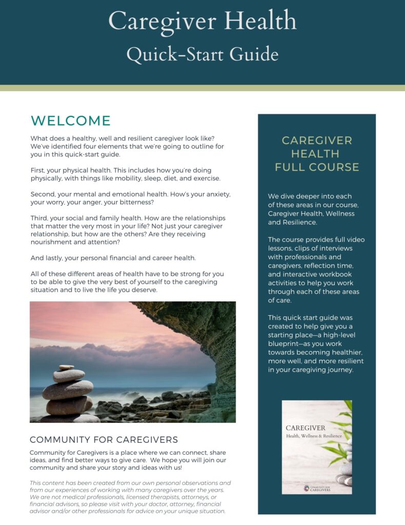 Download the Caregiver Health Quick Start Guide to learn more about the four elements of caring for yourself as a caregiver.